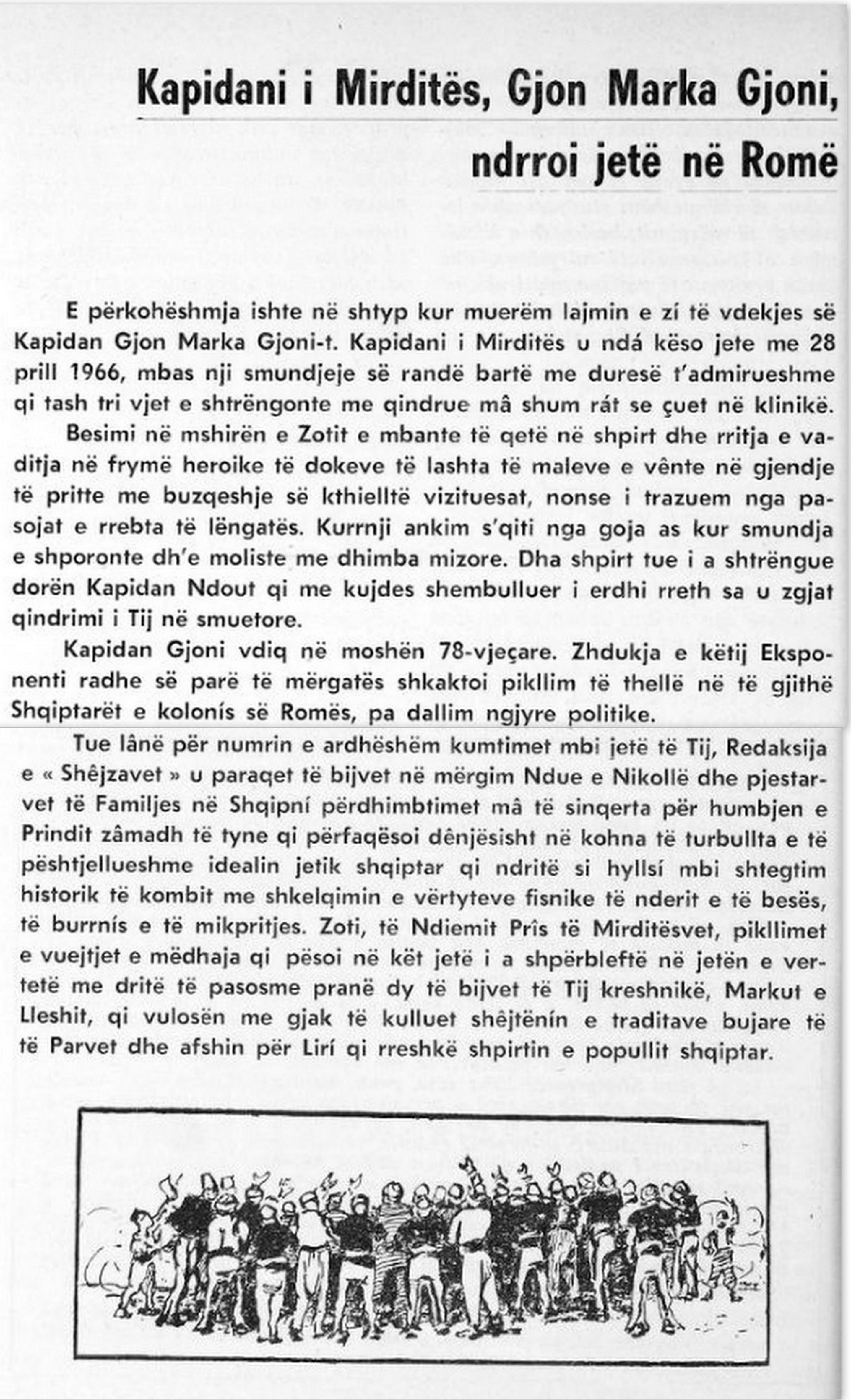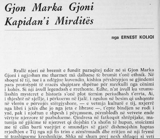 Pergjate perpjekjeve te mia njerzore per ti sherbye sadopak gjakut tem, deres ku kam lindun dhe mbar dyerve qe kan te tilla histori, pergjate rruges teme te dashnise per Mirditen dhe honet e saja plot histori, pergjate perpjekjeve te mia po njerzore per te hulumtue mbi te gjitha shkrimet e ndalueme prej regjimit totalitar komunist, qysh vitesh perballe shtanges se shtetit shqiptar per tua mohue per se dyt mirditasve historine e tyne, mora akt nga gjuha e dlirte e Koliqit nder shkrimet e tija,e po ju sjell nder votrat tuaja nje pjes te shenimeve te Ernest Koliqit ne rastin e kalimit ne amshim te kapidanit te Mirdites Gjon Marka Gjoni me 26 prill 1966.