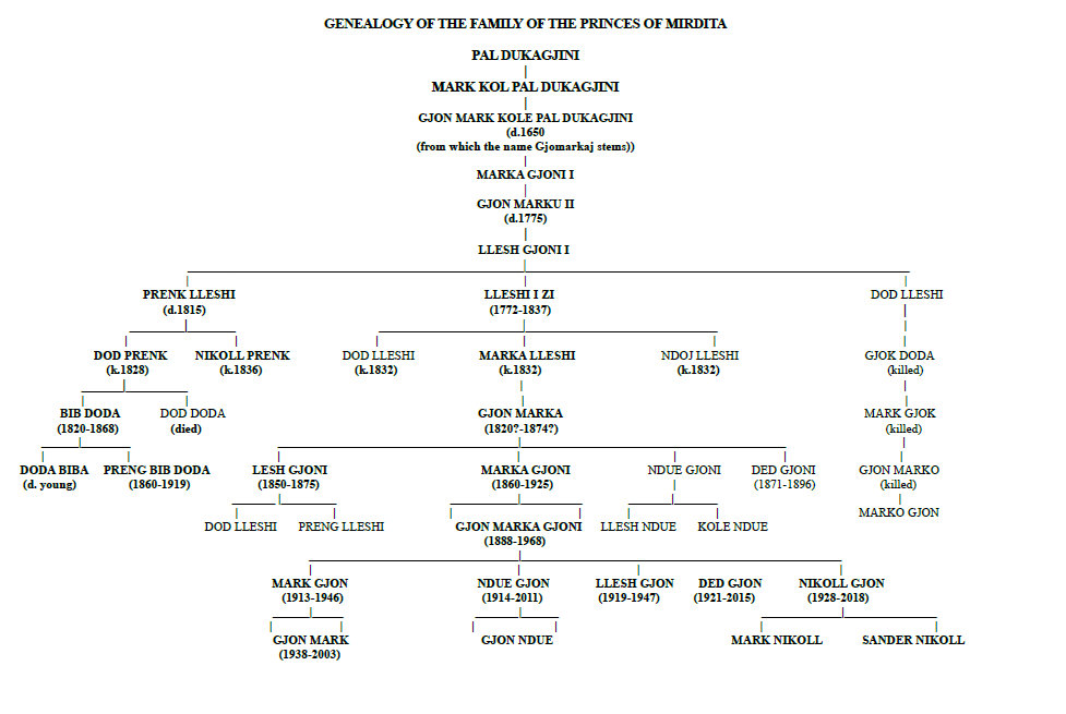 After his death (1775) he was succeeded by his son, Llesh Gjoni who, like him, made war his profession. He was instrumental in the joining of Mirdita into four Bajraks (Flags): Orosh, Fan, Spac and Kushne, making their political and military position stronger. His deeds threatened the Ottoman government and ultimately he was killed in battle, leaving three sons: Prenk Lleshi, Llesh i Zi and Dod Lleshi. It is with these, as ancestors of the existing family members, that we are most directly concerned.