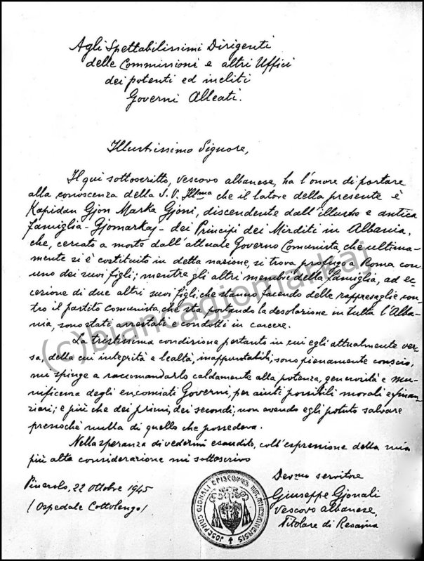 The undersigned Albanian bishop has the honor to introduce to your illustrious, that the bearer of the following is Kapidan Gjon Marka Gjoni, descendant of the illustrious and ancient family Gjomarkaj – Princes of Mirdita in Albania who, wanted under a death warrant by the current Communist government, which has recently established itself in that nation, finds himself a refugee in Rome with one of his sons, while the other members of the family, with the exception of two other sons of his, who are making reprisals against the Communist party, which is bringing desolation to all of Albania, were arrested and taken to jail.