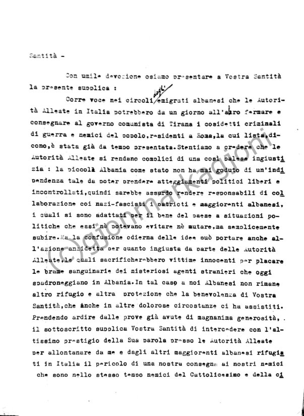There is a rumor in the circles of Albanian emigrants that the Allied authorities in Italy could stop and turn-over, from one day to the next, to the communist government of Tirana, the so called war criminals and enemies of the people who are residing in Rome, whose list, they say, has already been presented. We find it hard to believe that the Allied authorities would make themselves accomplices of such open injustices: the small country of Albania, as a state, has never enjoyed the total independence allowing it to assume free and uncontrolled political attitudes, so it would be absurd to make Albanian patriots and leaders, who to adapt for the good of the country to political situations which they could neither avoid nor change, but simply endure, responsible of collaboration with the Nazis-Fascists. But today’s confusion of these ideas may also lead to the aforementioned action, however unjust, on the part of the Allied authorities, which would sacrifice innocent victims to appease the bloodthirsty desires of the mysterious foreign agents who today dominate in Albania. In this case, we Albanians have no other refuge or protection other than the benevolence of Your Holiness, who has also assisted us in other painful circumstances. Drawing on the courage from the evidence already shown of magnanimous generosity, the undersigned besieges Your Holiness to intercede with the highest prestige of your word to the Allied authorities to distance from me and from the other major Albanian refugees in Italy the danger of our surrender to our enemies, which are at the same time enemies of Catholicism and European civilization. If the repeated requests of the communists of Tirana were likely to be immediately satisfied by the Anglo-Americans, we implore that the privilege of taking refuge in some of the Vatican buildings, which enjoy the right to sanctuary, would be afforded to some of us.