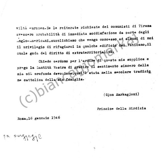 The following letter was written by Gjon Markagjoni to His Holiness Pope Pius XII as a plea for assistance to him and other Albanian leaders who had emigrated to Italy and were being sought by the communist regime of Albania to be extradicted under death warrants.