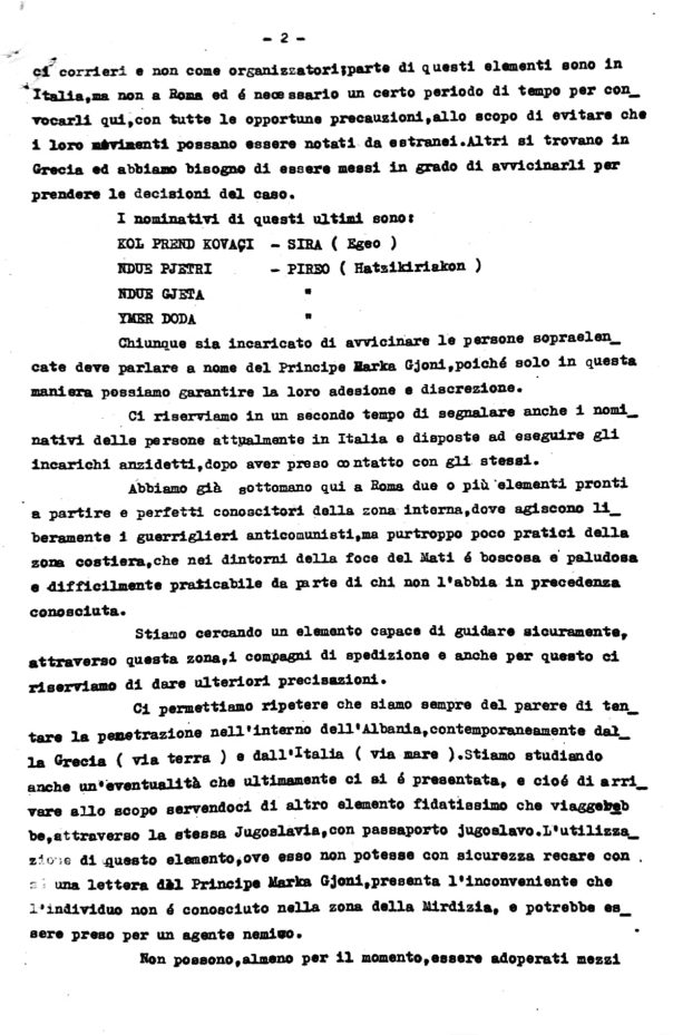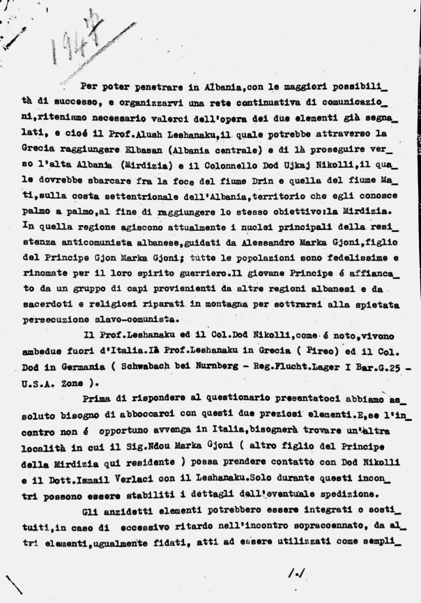 In 1947 members of the BKI were contacted by U.S. and British Intelligence regarding possible anti-communist missions into Albania. This memo is in response to a questionnaire sent to the leadership of the Bloc to determine their interest in future operations. The memo is a copy of the original Italian transcript of the Albanian response sent to the Allies by the leaders of the BKI in 1947. (English version follows)
