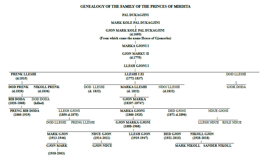 According to Don Prend Sul Spaci, who was undoubtedly the greatest expert of the specific Mirdita Kanun and the main source of the well-known Gjecov compilation, the Dynasty is currently divided into six branches, one of which, by right of majority, would constitute the direct descent of the old Dynasty. While another branch, by unanimous will of the 5 Flags in recognition of the Ecclesiastical Authorities and of all the other Tribes, as well as by consent of the eldest branch, currently enjoys and exercises all the prerogatives of the dynasty since the death of Prince Preng Bib Doda. That branch is that of Gjon Markaj, represented by Mark Gjon Marku. After his death, his son Gjon Marka Gjoni inherited the title; he was able to measure his influences and authority beween 1926-1928, by being able to exercise the function of supreme judge with an itinerant court called Zabit Name and pacify 620 pending blood revenge issues.
